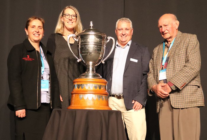 L-R: Nukuhia Hadfield, Chair Ahuwhenua Trophy; Jo Finer and Rob Macnab, NZIPIM; and Leigh Bason.